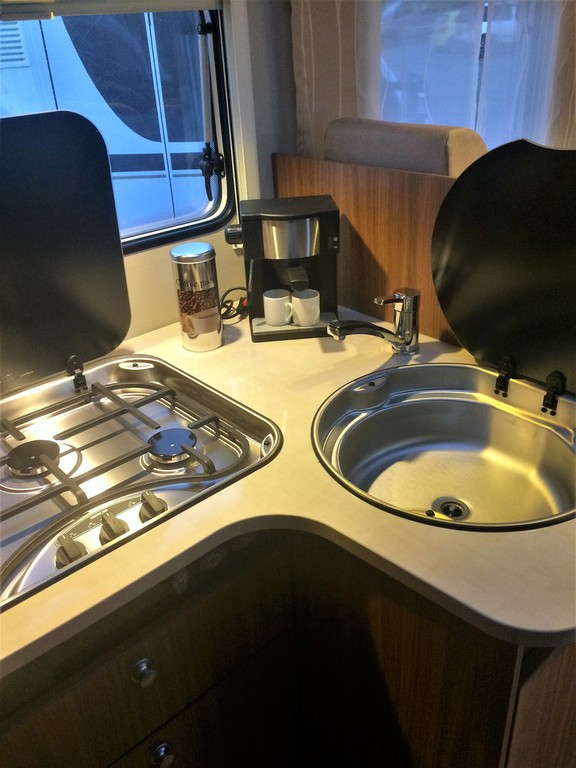 Standtisch. Die Winkelküche mit seinem 2-Flammen Kocher und großer Spüle läßt keine Wünsche offen. Der große 158 l Kühlschrank mit seperatem Eisfach sorgt für Ihr leibliches Wohl.