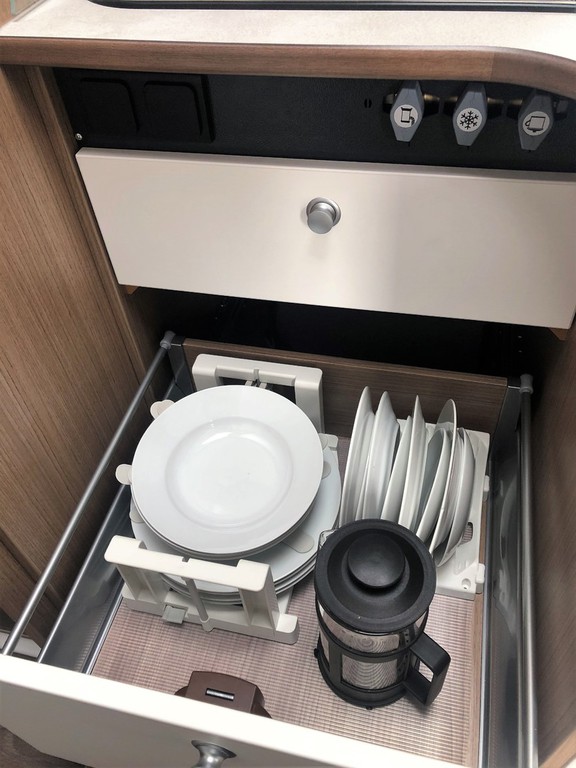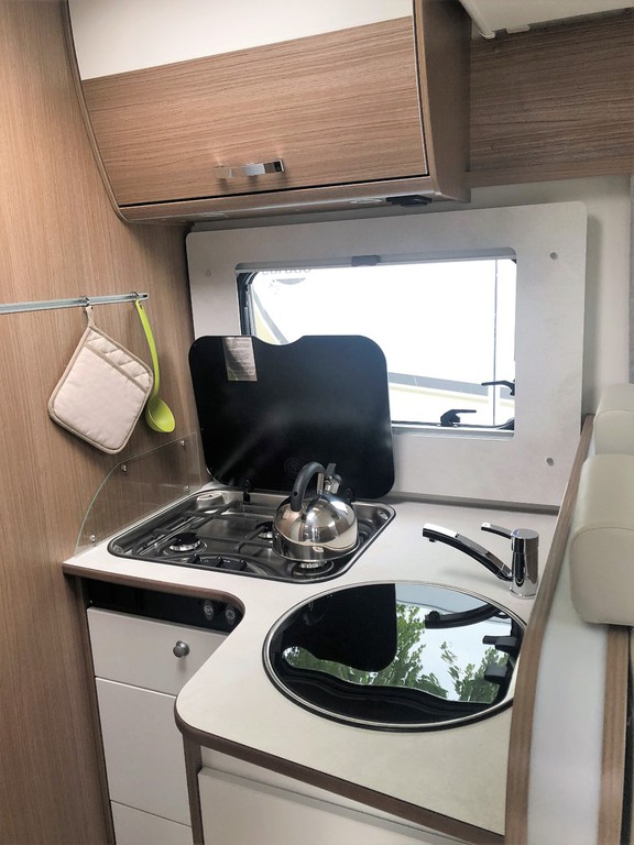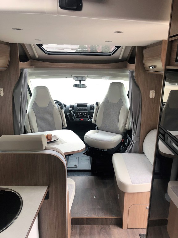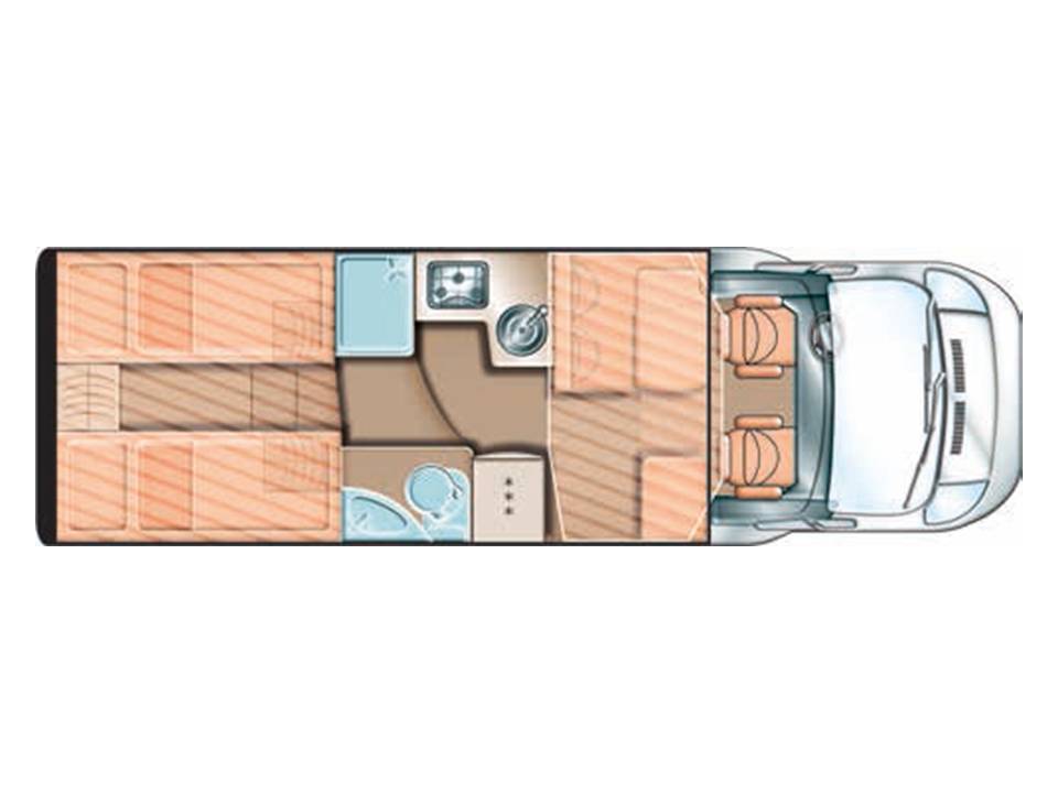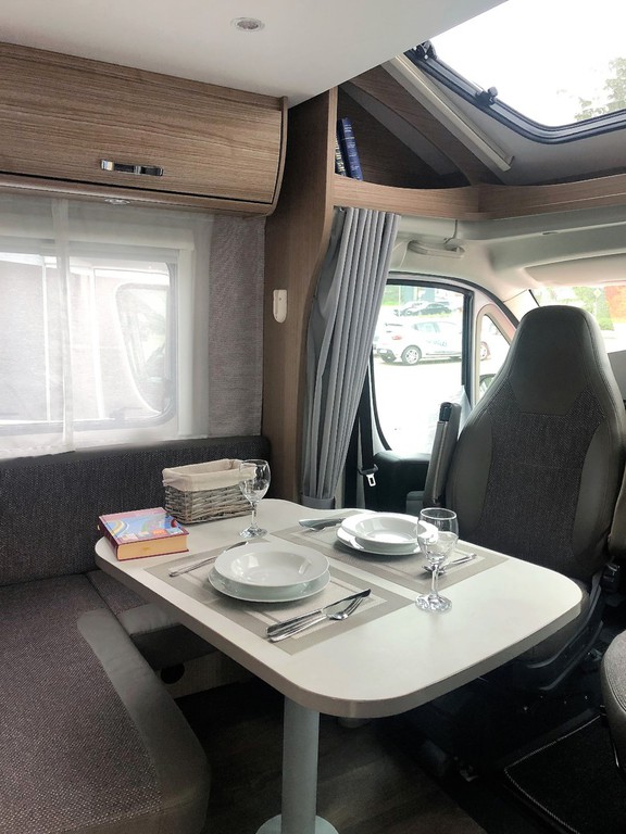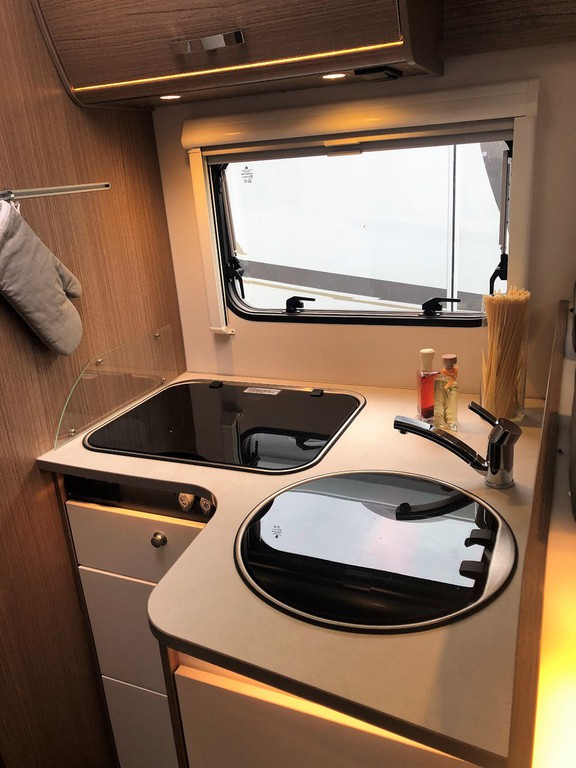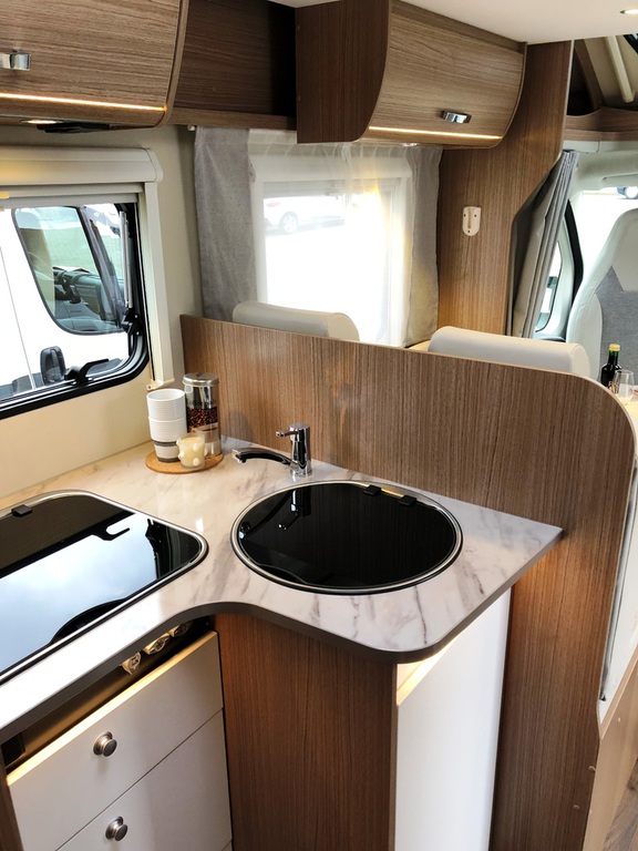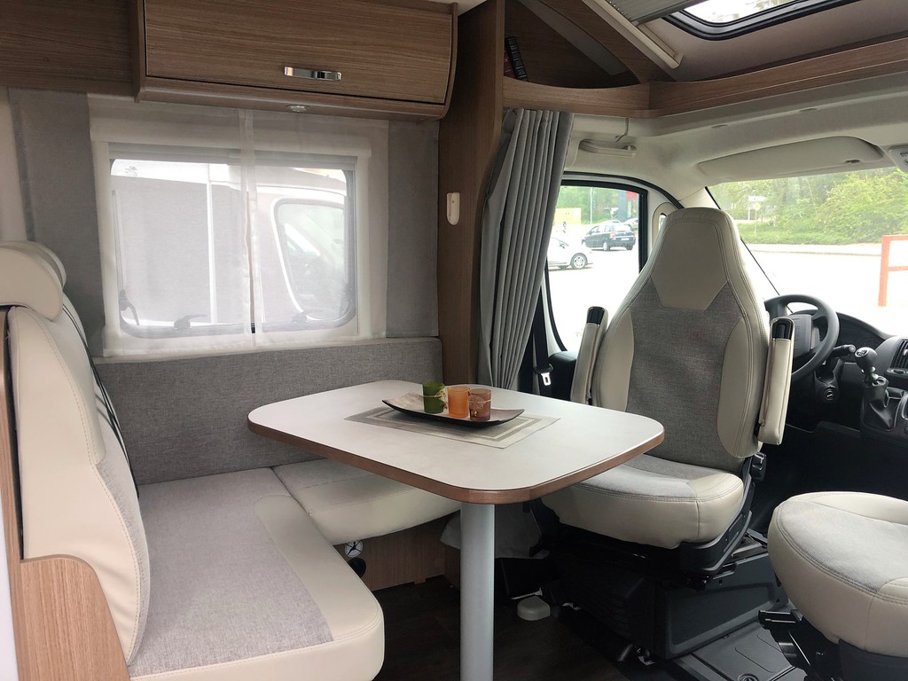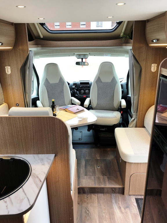 Beide verfügen über komfortable Einzelbetten, eine Winkelküche mit großer Kühl-/Gefrierkombination, einer Dinette mit herausnehmbaren Tisch und einem Variobad., allerdings auf einer Gesamtlänge von nur 6,96 m Dadurch wird das Wohnmobil wendiger und ist auch noch in Großstädten gut zu rangieren.
