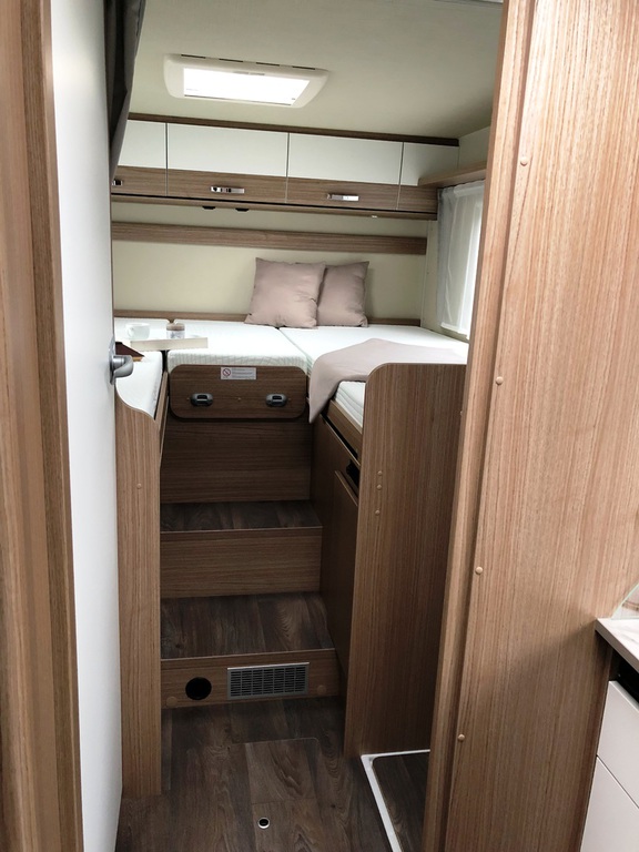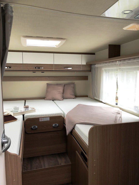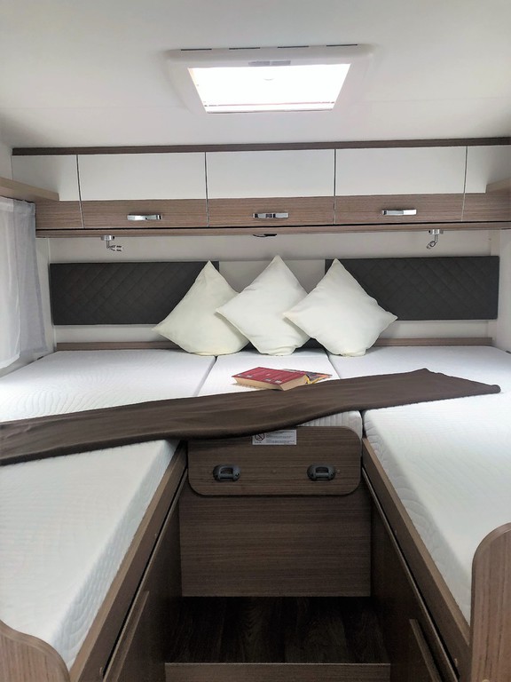 Das Reisemobile verfügt über zwei Einzelbetten, mit Aufstieg zwischen den Betten und Verbindungspolstern im Oberkörperbereich. Die Betten eignen sich besonders für große Personen durch Ihre Maße 0,80 x 2,05 + 0,80 x 2,12 m.